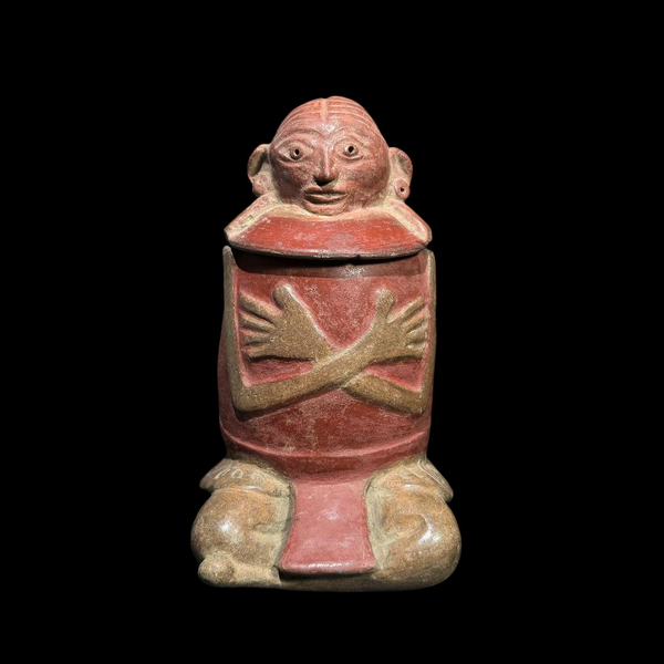A superb Maya effigy lidded vessel, finely modeled as a kneeling individual with arms crossed upon the chest in a gesture symbolizing repose and transformation. The head, forming the removable lid, displays expressive almond-shaped eyes, parted lips, and incised coiffure lines beneath a smooth domed crown, framed by large circular ear ornaments. The cylindrical lower section is decorated with modeled limbs and a front apron panel, all executed in rich red and cream slip with traces of original burnish and mineral deposits from long interment.